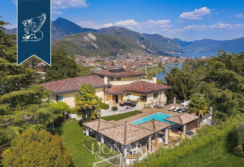 This stunning villa for sale in the province of Bergamo is in an extraordinary hilly position with beautiful views of Lake Iseo, surrounded by a complex with a big park with a pool. The house for sale stands out for its size and charm: with its 710 sqm of internal surface, developed on three levels, this luxury property is one of the largest in the entire complex, which consists of 52 villas and a castle. An exclusive private swimming pool enriches the big outdoor area that measures 3,000 sqm, and includes a 1,000-sqm well-tended lawn with a charming pool house and a convenient gazebo. Recently renovated with utmost attention to detail, the villa has a driveway that leads to a big parking area with two double garages, and to the big courtyard. The main house features a spacious living room with a separate kitchen, both overlooking a splendid terrace with a wonderful view of Lake Iseo. On this floor there are also three bedrooms, two bathrooms, and two storage rooms. The upper floor houses a second living room with a kitchenette, a bedroom, and a bathroom, as well as a panoramic terrace overlooking the lake. The basement features a study, a storage room, a big laundry room, a bathroom, a cellar, and a boiler room. Below the swimming pool there is a second house, smaller but equally prestigious. Ref: 5485.