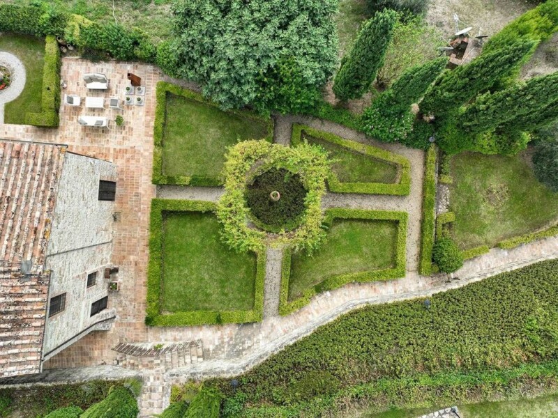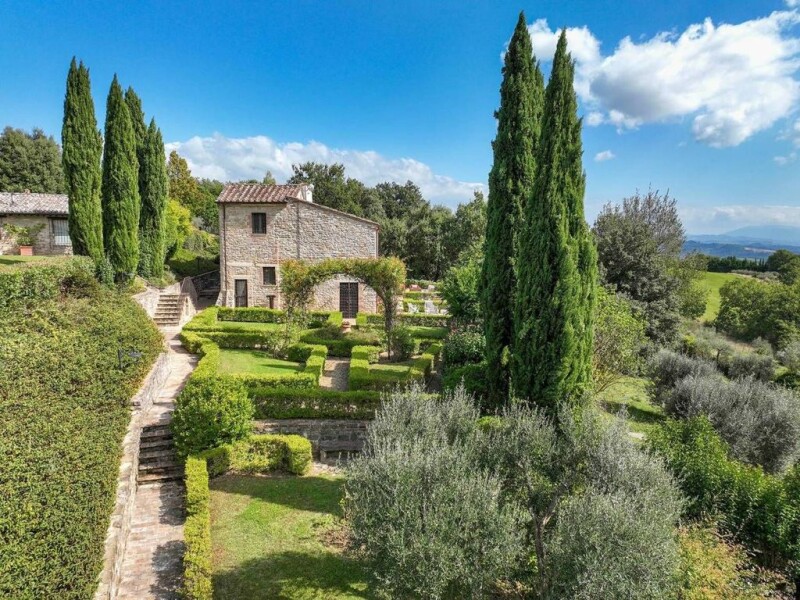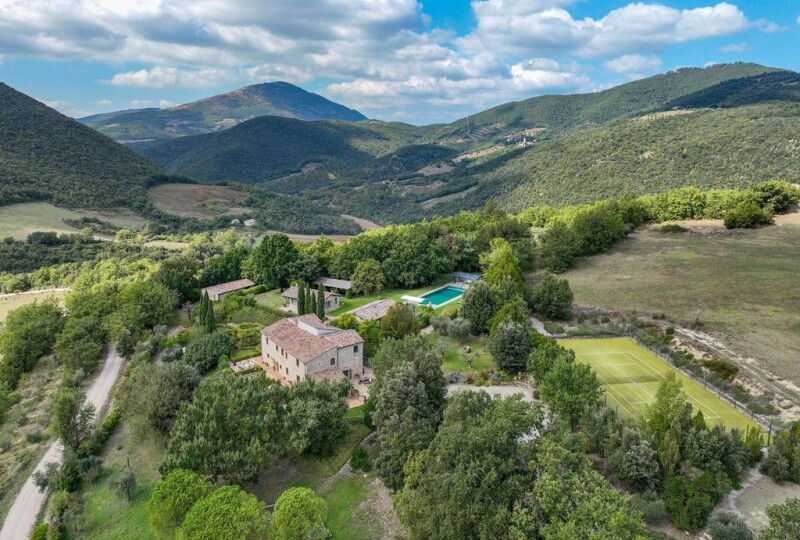 This exclusive estate is located a stone's throw from Antognolla Golf, one of the most fascinating 18-hole golf courses in Italy. Although the property is immersed in an oasis of woods and hills on a total plot of about 113 hectares, this location can still be defined as central and certainly not remote. Umbertide can be reached in 15 minutes, while the distance to Perugia is just under 30 minutes. The estate is composed as follows: the main house with a panoramic terrace, 3 residential annexes, a 25 x 6 metre swimming pool, a tennis court and a large car park. The estate is accessed through two separate electric gates. The main building of approx. 400 sqm is accessed via a large covered terrace where the entrance is also located. The ground floor includes a fully equipped rustic kitchen with ceramic worktop, dishwasher, American fridge, hot air oven and ceramic hob. In addition, there is a laundry room with exit to the rear terrace and a cosy living area with old wooden beams and terracotta floors, restored and recovered from the original building with patience and attention to detail. The whole exudes a timeless, classy and discreet atmosphere. A few steps lead to a room overlooking the living area, where there is an office and a guest bathroom. Each side of the house has access to one of the outdoor terraces with panoramic views of the valley below. An internal staircase leads to the upper floor where there are three bedrooms, each with its own bathroom with shower or bath. There is also an office that can serve as an additional bedroom. The property also contains 3 elegant outbuildings (62, 57 and 53 sqm respectively) with large windows that provide pleasant lighting. These buildings can be multifunctional and can be used as a living space with a fully equipped kitchen, bedroom and bathroom as they currently are, or they can be used for other purposes such as a yoga room, a gym, a wellness room or a relaxation room. One of the outbuildings also features an original wood-fired pizza oven. The décor is classic contemporary with furniture collected during the current owners' many travels, striking a perfect balance between rustic and modern. In the well-kept garden there is a covered terrace with mood lighting where it is very pleasant to relax at night but also during the day, as well as a 25 x 6 m mosaic swimming pool with sufficient depth for diving from the diving board and a pool house with sliding glass walls currently used as a gym. The outdoor pool bar offers refreshing cocktails during the summer months or can be used for receptions or larger events. If you don't feel like playing golf, exercising or swimming, there is also a well-maintained tennis court. The entire estate is set in beautiful parkland where the main building and outbuildings are sufficiently separated to ensure a high degree of privacy. The estate is about 1.5 km from the SP 728 in the direction of Umbertide and Perugia. The E 45 allows easy access to all destinations.