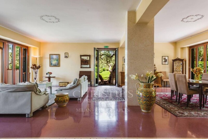 Christie's International Real Estate offers for sale this enchanting property located on the top of a hill overlooking the golden beaches of the Tyrrhenian Sea on the outskirts of Messina. The house, designed in every detail and intended to be inhabited by the family, was built in 2006 in a space of eight hundred square meters well distributed over four levels communicating with each other with an internal staircase and lift. The rooms, harmonious and elegant, characterized by light colors in shades of yellow, evoke lightness, warmth and happiness; a sunny house in absolute harmony with the long, hot days that characterize the island's climate. Modern and functional, made with quality materials in the classic Sicilian style: marble, porcelain stoneware, Caltagirone ceramics, natural stone mosaics in shades of cobalt blue, emerald green and magenta, floors decorated freehand with geometric and floral motifs , wooden and wrought iron furnishing accessories, Vienna straw and showy vases, give the house a unique design with a timeless charm, a riot of emotions and colors. Opening, the first level houses the study room, positioned to the right and well disengaged from the rest of the area made up of four large rooms used as storage, cellar and laundry. The living area, sober and refined, arranged on the ground floor, represents the nerve center of the house, it houses a linear and functional kitchen, two bathrooms, two bedrooms, one of which is used as a walk-in closet and the large living room, opening onto the luxuriant garden thanks to large windows; the French window, which clearly divides the living room from the dining area, displays a large ornamental olive tree, intentionally left in front of the house door as a symbol of peace, love and hope. Upstairs, a sequence of bedrooms slides down the corridor, seven in all and four bathrooms; each room overlooks the terrace that surrounds the entire floor, as well as on every level of the house. The beauty of the panorama that can be admired there is disarming, all-encompassing. It penetrates like light, with absolute grace, emphasizing the space of the rooms, enveloping them with its bright colors and with the fresh sea breeze, which gently cradles the seductive Aeolian islands placed in the background like a glorious painting of nature. In the attic, there is an apartment that consists of three bedrooms, each with an en suite bathroom, a kitchen and an enveloping living room where in the evening you can relax on the sofa under the starry sky of the skylights; on winter days, the fireplace framed by carved marble creates warmth, welcome and intimacy. The elegant residence, equipped with heating, air conditioning and a solar system, is surrounded by a verdant garden of five thousand square meters dotted with rows of precious olive trees, elegant palms and luxuriant specimens of cycads. The sculpted hedges that flank the driveway create large, flat flowerbeds embellished with flower.