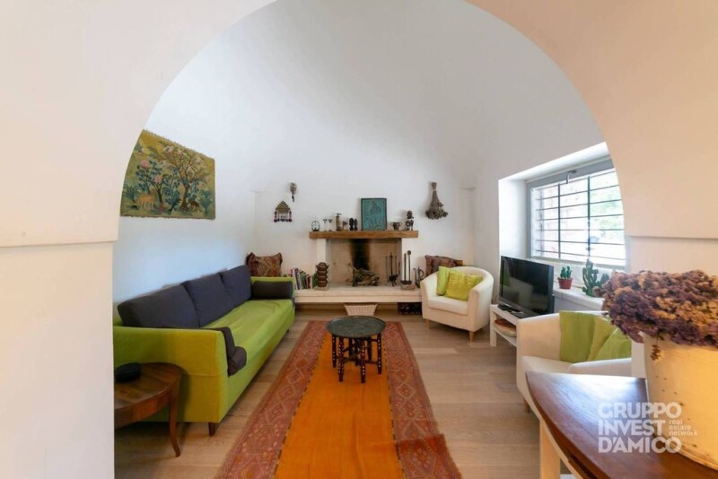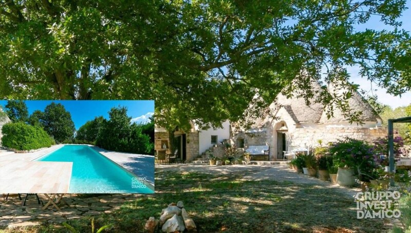 TRULLI (6 cones) AND LAMIE RENOVATED (partly newly built) located in OSTUNI in the Chiobbica district, in the Itria Valley in a PANORAMIC position. The HOUSE consists of a living area divided into a dining room with a relaxation alcove, finished with exposed stone, a living room with a fireplace, a kitchen and a hallway, as well as two bedrooms, two bathrooms and a laundry room. Adjacent storage room with an independent entrance. Outdoor area, partly paved in stone and equipped with shade, SWIMMING POOL with solarium and outdoor shower, and partly used as a green area with ornamental plants and large oak trees under which to find shelter on hot summer days, as well as flower beds delimited by dry stone walls and walkways. Adjacent land measuring approximately 15,370 square meters with olive trees and oaks. Water collection tank. Heating with LPG tank. Alarm system connected to the security station. Internet system. Video intercom. Fenced property with access from electric gate. Part of the furniture included in the sale.