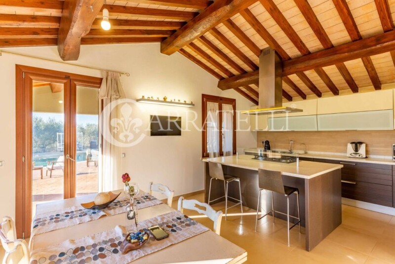 Wonderful modern villa of 200 sqm with private garden, swimming pool and dependance set in a very pleasant and elegant context of villas built a few kilometers from the sea and the renowned beaches of the Tuscan coast. The olive grove of the property, framing the villa, leads us to think of fully experiencing the Tuscan countryside but the sea breeze enters from every window bringing refreshment and well-being. Location San Vincenzo is located in the stretch of coast south of Livorno, which takes the name of the Etruscan Coast and which extends from the capital to Piombino. Located in the Livorno Maremma or the historic Pisan Maremma, it is bordered to the north by the municipality of Castagneto Carducci and to the south by the coastal park of Rimigliano and the municipality of Piombino. Strategically positioned, it allows you to reach the historic cities of Pisa in less than an hour and a little more the one of Florence; the services of the small seaside village are of a high standard such as the marina and restaurants. Description Leaving the state road, walk a few hundred meters and reach the villa with its automatic access gate. You enter the large flat private garden facing the villa, along the well-kept stone path you reach the entrance on the ground floor. High arcades surround the entire living area characterized by large windows that give light to the interiors. From the armored entrance door you enter the large living area characterized by double height and large spaces. The kitchen is very large and fully equipped; on the ground floor there is a large double bedroom with its service and the boiler room. Going up a comfortable internal staircase in stone and steel, you reach the first and last floor which partly overlooks the living area and is therefore very bright. Three double bedrooms and a service bathroom complete the warm and welcoming sleeping area. An additional apartment currently used as an office has been built next to the pool, has been prepared at the level of systems and spaces to be the guest area or a pleasant spa. State and finishes The modern villa was built in 2008, perfectly maintained and subject to continuous maintenance by the owners who live it with great love. The external floors are made of stone while the precious parquet in light, marine tones has been placed inside, which gives warmth to the rooms and goes very well with the stone and plaster used in the wall covering. The typical Tuscan touch is found in the terracotta ceilings and exposed wooden beams, the bathrooms very particular for the use of precious and refined ceramics. Outdoor spaces The large swimming pool is beautifully inserted in the garden overlooking the villa while the olive grove produces oil with a typical Tuscan taste, pungent and straightforward. A covered parking area can accommodate three cars inside the garden but in a secluded and minimally invasive position. The garden is planted with tropical palms, fruit trees and hedges which in spring release intense aromas. Potential use Excellent property for those who want to establish their main residence in a place near the sea.