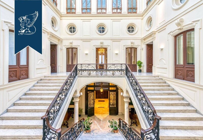 This prestigious 1,300-sqm flat is located in the aristocratic district of Chiaia, Naples, just steps from the seaside. Occupying the entire Piano Nobile of a historic 19th-century building, the flat boasts high ceilings, large windows, and bright, spacious interiors. It includes three suites and eight bathrooms, with an upper floor housing six office rooms and eight additional bathrooms. A 200-sqm terrace encircles the main floor, offering a relaxing outdoor space with sea breezes. Commissioned by Duke Thomas of Savoy and designed by architect Augusto Guidini, the building has a unique structure, set in the center of a garden with four corner buildings. Access is through two entrances, including a grand one leading to a majestic white Carrara marble staircase that opens onto the main hall. This room, once a theater, features gilded details, raw silk panels, and a grand marble fireplace. The main floor also includes a professional kitchen, dining rooms, a library, a study with terrace access, and three luxurious suites. The upper floor, with frescoed ceilings and parquet floors, can be used as offices or living spaces. The flat offers the flexibility to be a single residence or divided into two units, making it an ideal choice for those seeking a stately, historical property in Naples. Ref: 12917.