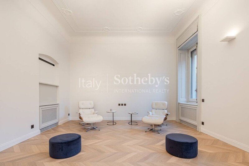 Situated in one of Milan's most prestigious areas, this exquisite apartment, located on the noble floor of a historic building, has recently undergone a meticulous renovation with premium finishes. The property showcases a seamless blend of elegance and refined design. Modern, versatile spaces are artfully integrated with classical elements, creating a bright, airy atmosphere ideal for those who appreciate exclusive, timeless style. The expansive living room, flooded with natural light, offers a captivating view of Viale Bianca Maria, while the kitchen and sleeping quarters overlook a serene internal courtyard. The property features a spacious and luxurious master bedroom, complete with an en-suite bathroom, which includes a bathtub, shower, and access to a delightful private balcony. The sleeping area is further complemented by two additional bedrooms, each served by elegantly appointed, functional bathrooms. The kitchen, fully furnished with high-end appliances, is enriched by a striking period fireplace, which contrasts harmoniously with a modern designer chandelier. A practical balcony completes the space, making it an ideal setting for those who appreciate cooking in an inviting yet sophisticated environment. The apartment offers an array of exclusive features, including an advanced home automation system, security alarm, independent heating with a state-of-the-art boiler, and ducted air conditioning. Throughout the property, high-quality parquet flooring enhances the overall warmth and refined elegance. The property also benefits from a spacious private cellar and the convenience of a full-time concierge service, further elevating the living experience.