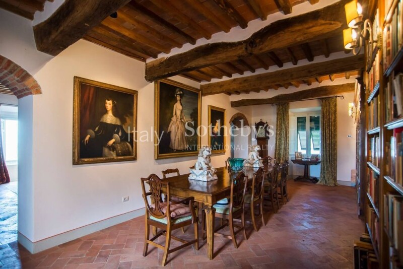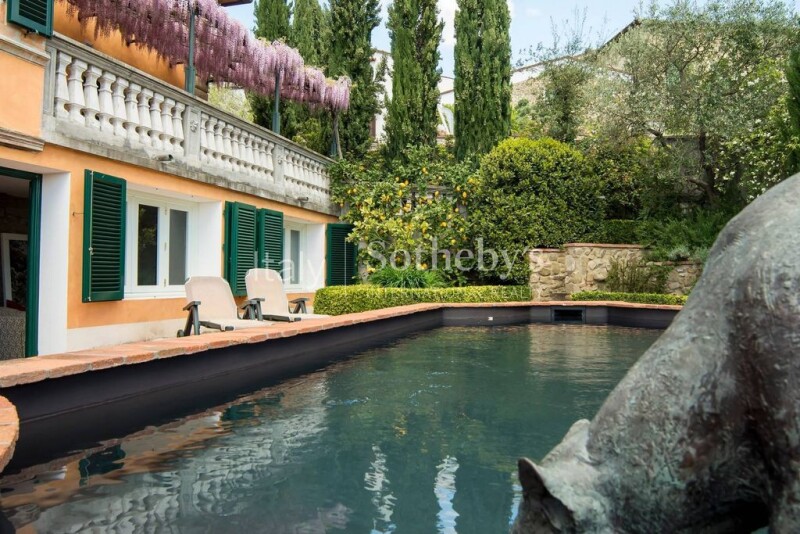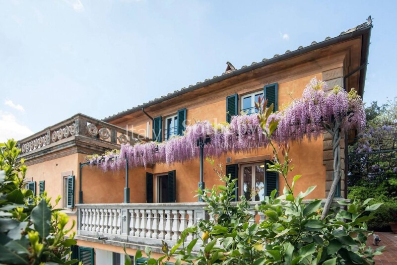 Elegant four-storey villa situated in a panoramic and sunny position, at the edge of a picturesque hillside village near the renowned Montecatini Terme Golf Club and the Grotta Giusti SPA centre in Monsummano Terme. The villa has two entrances, one from the ground floor, and the other from the side street that also leads to the private parking of the villa and the family floor. The Ground Floor has a large entrance hall with a staircase leading to the upper floors and two rooms used as a cellar / laundry area and a technical room. The First Floor houses a master suite with bathroom; a large hallway with brick arches leads to another guest room with a further bathroom, and a breakfast room with access to the side garden. The Second Floor is characterized by a large living area, with a wide living/sitting room with fireplace, dining room, kitchen, and access to both the panoramic balcony and the beautiful wisteria-covered 100 sqm terrace, as well as the garden with plunge pool and ample space for outdoor dining. The last attic floor comprises two study/ single bedrooms, the wide master bedroom, with en-suite bathroom, utility room, and access to the splendid roof terrace with views of the surrounding valley. The original architectural features of the villa have been kept intact, with exposed chestnut beams, antique terracotta floors, and a magnificent travertine marble staircase that connects the various floors. The garden surrounding the villa is the classic Italian style with beautiful fountains and harmonious hedges that enhance its elegance, with the touch of the salt water pool for the hot summer days. The panoramic views of the olive groves and the surrounding villages are simply unique. The villa's location is strategically perfect, as in just a few minutes you reach the renowned 18-hole Montecatini Golf Club, the town of Monsummano Terme with various shops and services, while the first bars and restaurants are located within the picturesque hilltop village.