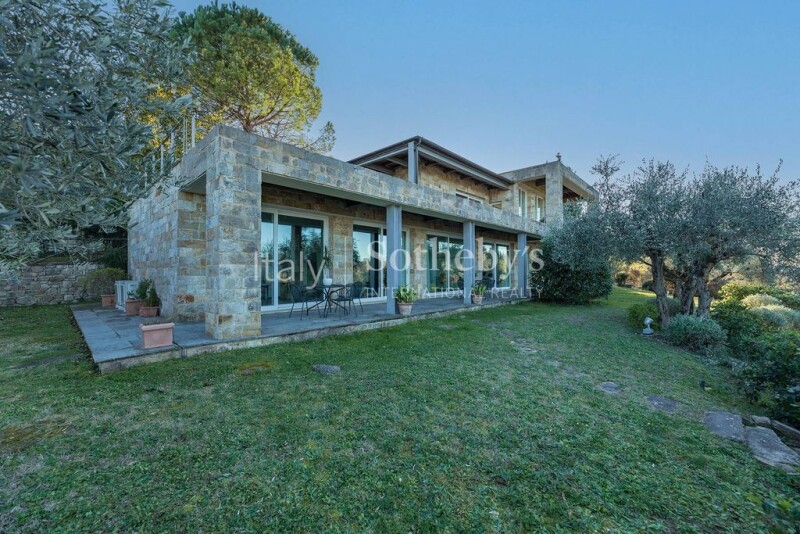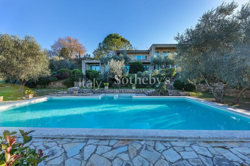 A spectacular villa nestled in the Umbrian hills, just 10 minutes from Todi, this stunning designer residence, built in 2016, stands out for its modern and bright architecture, offering an open view of the gentle surrounding hills. Designed by artists Roberto Bernardi and Raphaella Spence, the latter being the niece of the renowned British architect Sir Basil Spence, the villa is the result of an innate passion for art and architecture. It is the first modern residence in the area, built using traditional materials such as local stone and wood, harmoniously combined with large glass windows to create a perfect continuity between indoor and outdoor spaces. A true dream, ideal for sharing special moments with family and friends. The villa is spread over two levels. On the ground floor, a spacious and welcoming living room is perfect for relaxing and enjoying the tranquility of the countryside. Also on this level are three large bedrooms, each with a private bathroom and direct access to the porch and garden, as well as a laundry room. The first floor, connected by an elegant wooden and iron staircase that enhances the height of the property, features a lounge area, dining space, and an open-plan kitchen, along with the master bedroom with a private bathroom and panoramic terrace. The property is equipped with underfloor heating and cooling, ensuring maximum comfort in every season. The estate extends over 1.3 hectares (3.2 acres) and boasts a meticulously maintained garden that includes a heated swimming pool, with a dedicated children's area, a barbecue area covered by an elegant pergola, and an independent studio of 88 sqm (947 sq ft) designed as an extension of the main villa and currently not connected. The semi-basement of approximately 70 sqm (753 sq ft) is yet to be completed and offers additional accessory spaces. The property also includes 70 olive trees and a charming pond. Perfect for year-round living or as an exclusive residence for luxury vacation rentals, this villa represents a unique opportunity in the heart of Umbria. Distances: Rome 90 km (56 mi), Florence 188 km (117 mi), Perugia 51 km (32 mi), Lake Corbara 20 km (12 mi), Orvieto 30 km (19 mi).