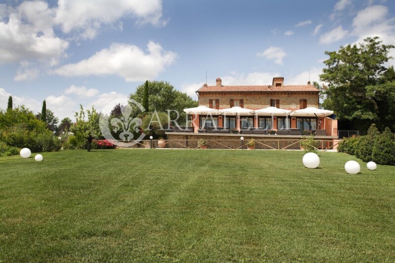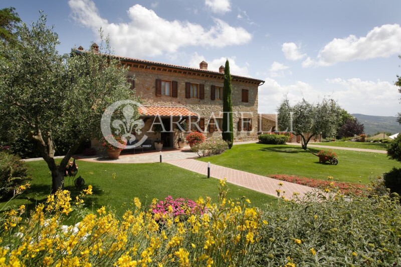 Wonderful and panoramic village of 2500 square meters overlooking and inserted in its private land of about 80 hectares planted with olive trees, vineyards, arable land and woods; located in the center of a territory known since ancient times for the presence of its regenerating saline waters and a fundamental stop on the Via Francigena, Gambassi Terme is a place historically suited to well-being and hospitality. The atmosphere is magical, the gaze is lost among the rolling hills located at the foot of the structure until you see Volterra, wonderful and precious. Location Located at the top of a small promontory surrounded by sinuous hills, finely cultivated, this typically Tuscan village runs along the ancient Via Francigena, a famous crossroads of people and goods. Easily reachable, fifty kilometres away from Florence, it is located in the heart of the Chianti Classico. immersed in nature trails on horseback and on foot that lead to the discovery of famous wineries and typical Tuscan trattorias listed for good food and wine. Description Wonderful building complex of 2500 square meters inserted in an area mainly of agricultural and tourist vocation. Along the state road that leads to Volterra with a spectacular view of the Volterrana basin stands this property consisting of 6 carefully restored buildings .Through three driveways in wrought iron and an agricultural step leads to the property completely fenced and immersed in 735000 square meters of land cultivated with vines, olive trees, arable land and woods. The road system inside the village is excellent and the buildings are well disengaged and accessible by means of transport. A large parking lot can accommodate many cars without interfering with the harmony of the place. The first nucleus consisting of three buildings dates back to 1800, now renovated with excellent internal and external finishes. The main villa of 554 sqm consists of a large entrance area, an industrial kitchen, three offices and a service. A bright, large and panoramic room overlooks the equipped terrace while the fully glazed dining room overlooks the garden and offers unique views on the valley. On the first floor, connected by an internal staircase to the entrance floor, there are four double bedrooms all with bathroom. A short distance away there is a former barn of 190 sqm currently divided into two comfortable apartments with independent entrance and private courtyard, both composed of a large living area with kitchenette, two double bedrooms, hallway and bathroom. The 133 sqm former pigsty is spread over an above ground floor as well as a mezzanine floor divided into two houses each with kitchen, bedroom and bathroom. A characteristic star-shaped building of about 155 sqm is currently used as a living and chilling area consisting of large spaces with direct access to the garden which in summer is equipped with comfortable sofas and tables to admire the suggestive sunsets. A short distance along the perfectly maintained driveway you reach the building of 779 sqm which is spread over three floors and is divided into five apartments on the ground floor and three on the first floor, all with independent entrances. The typology varies for the number of rooms, two or three with single or double bathroom. The private outdoor space and panoramic terraces or loggias characterize this part of the structure. Particular attention has been paid to accommodate people with different motor skills by creating two apartments of 94 sqm with special equipment. The whole complex is served by the panoramic swimming pool of an irregular shape inserted in the well-kept garden full of flowers that in spring create an enchanted atmosphere. Outdoor spaces The property has an area of 73.50 hectares: the main part consists of an extension of approximately 48.5 hectares in addition to 2.5 hectares of Chianti vineyard and the remaining 21.50 divided between olive groves (210 plants), arable land, pasture, two lakes for irrigation and sport fishing. The property is crossed by well-trodden roads that take us with a jeep to places of wild nature and intense scents. The garden facing the houses is flat and houses a beautiful fountain with water features that can be transformed into a second swimming pool. Fruit trees, pines and wonderful hedges of medicinal herbs can be found walking around the vast, completely fenced estate. The vineyard produces about 30 quintals of grapes and can be improved by planting younger vines. The Chianti Classico is currently in production, the oil is the typical Tuscan one with a slightly pungent and genuine taste. State and finishes All systems are up to standard and constantly maintained. The renovation was done in a complete and accurate way. The materials used are native and the style is typical of Tuscany. The high ceilings are with exposed beams and terracotta, the terracotta floors also create a beautiful combination with the warm-toned walls and the light marble kitchen. The internal and external windows are made of wood, the roof with tiles, numerous fireplaces give heat to the environment while the air conditioning system provides cooling during the hot summer days. Potential use Due to its intrinsic characteristics, the property could also be used for tourist accommodation and event organization. A building area of about 400 square meters could be used to build a luxurious wellness center set in the greenery and with a breath-taking view. The property is currently used as a private residence.