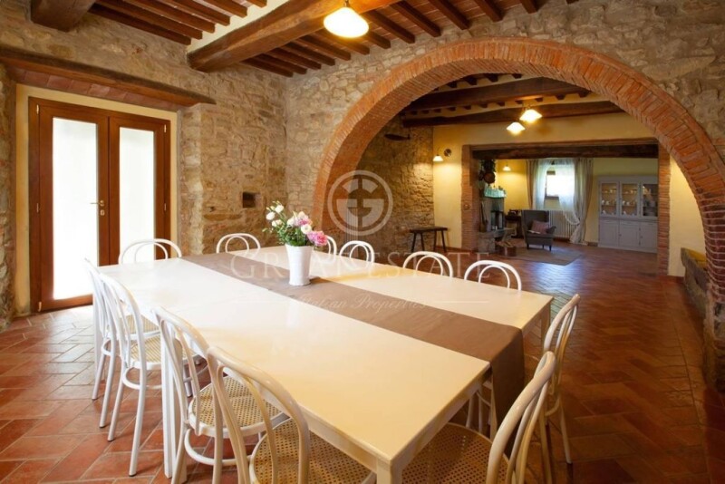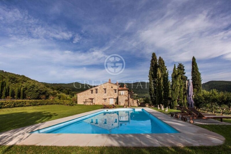 A few kilometres from Arezzo, in a very private location but close to all services, farm for sale with farmhouse of 454 sqm on two levels, swimming pool and 40 hectares of land.nThe Argo farm, reachable by a white road in excellent condition, 3 km from the city of Arezzo, is composed of a recently restored farmhouse of 454 sqm on two levels. On the ground floor there are two large living rooms and a very functional kitchen, a study and two bathrooms. The second floor, on the other hand, houses two flats which communicate with each other and are composed as follows. Both rooms include a bright living area, a kitchen, two double bedrooms and a bathroom with shower. You can also enjoy a magnificent view of the land and the surrounding hills from the beautiful stone loggia. Outside, the property is surrounded by a very large patio, where it is possible to organize dinners and lunches also thanks to the presence of an oven that was used to make bread. The farm includes immense land of 40 hectares that extends all around the property and is characterized by forests of oak trees and over 1,000 olive trees. The property is completed by a panoramic swimming pool measuring 6x15 meters and an adjoining outbuilding used as a warehouse of about 40 square meters. The strong point of this property is certainly the proximity to all primary services, reachable in just a few minutes, without sacrificing privacy given the very private location.nState of repairnThe property, which dates back to 1400, was completely restored in 2012 trying to maintain the prestige of the house, playing with valuable elements of the Tuscan rustic tradition and modern elements. nUtilitiesnThe property includes all utilities. The heating is guaranteed by an autonomous methane system while the water supply is provided by an artesian well. The external irrigation system is already in place and working.nUse and Potential UsesnThe Argo farm is perfect both as a main residence and as a secondary residence as it is already in the rental circuit.nLocationnThe property is located only 3 km from the city of Arezzo. Other destinations within easy reach are Castiglion Fiorentino 20 km (25 minutes), Monte San Savino 25 km (30 minutes), and Cortona 30 km (35 minutes). The nearest airport is Florence, which can be reached in about 1 hour, otherwise it takes about two hours by car to reach the Pisa airport.nLand registry detailsnThe Great Estate Group carries out a technical due diligence on each property acquired, through the seller client's technician, which allows us to know in detail the urban and cadastral status of the property. This due diligence can be requested by the client at the time of real interest in the property.nOwnership details and eventual contractual obligationsnThis property is in the name of a natural person (s) and the sale will be subject to registration tax according to the regulations in force (see purchase costs from the private individual). n.