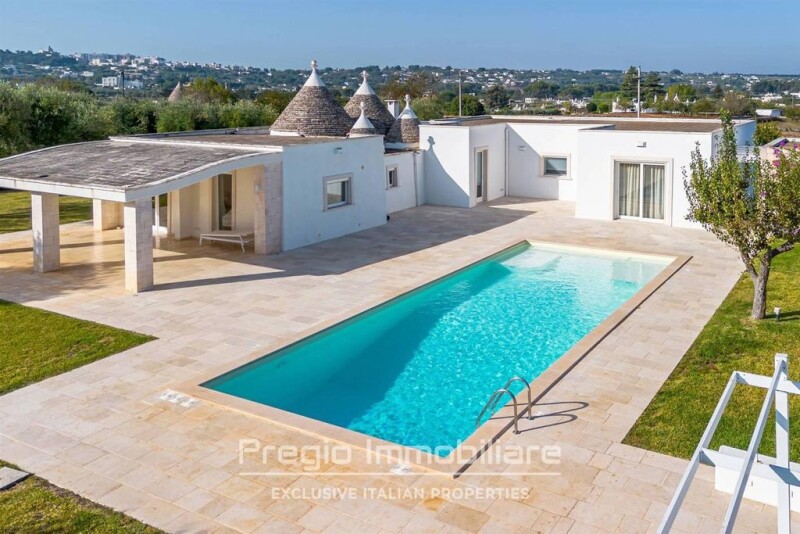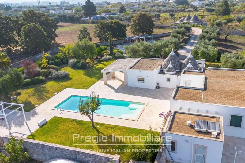 Located in a prime location, in the picturesque plain between Martina Franca and Locorotondo, this spacious villa offers a unique experience in a rural setting of rare beauty. The property, just two kilometers from the center of Martina Franca, offers the ideal balance between the tranquility of the Apulian countryside and the convenience of nearby urban services. It embodies the perfect combination of modernity and tradition in its refined architectural profile. This residence, with its seven rooms, three bathrooms, and three bedrooms, represents an oasis of comfort and sophistication. The interior spaces, carefully maintained, highlight the original core of the structure built around a group of trulli, which constitute the heart of the living area. The large open kitchen, the living room, the dining room, and the study create a welcoming and versatile environment. The master bedroom, in addition to its en-suite bathroom with a bathtub, also offers access to a private dressing room. Outside, a spacious covered veranda provides the optimal space for outdoor dining in total comfort. Finally, a separate three-room apartment serves as a laundry room, with a storage room and a service bathroom. The villa also boasts a wonderful pool, complete with a rigid cover for the winter months and dedicated service and technical rooms. The latest renovation was completed in October 2020, ensuring that the villa is in optimal condition and ready for its new owners. The entire property captivates with the timeless charm of its interior and exterior spaces, offering an idyllic place to enjoy the peace of the countryside and rural beauty composed of centuries-old olive trees, gardens, and ornamental Mediterranean plants that create a breathtaking landscape. Another distinctive feature of this villa is the exceptional privacy guaranteed by a complete fence around the entire perimeter, composed of a high dry stone wall, which in itself represents a typical architectural element of the Apulian tradition. The nearest urban amenities are just two kilometers away in Martina Franca, while the coast and the main tourist attractions of the region, including the beaches of Ostuni and Monopoli and the beauties of the Valle d'Itria, are easily accessible in a short time. This villa represents a unique opportunity that can adapt to your personal and investment needs. Whether you are looking for a year-round residence, a second home for holidays, or a profitable investment opportunity, this property offers multiple possibilities and a high potential for value appreciation over time. For more information or to schedule a viewing appointment, please contact Pregio Immobiliare or visit us at our office at Piazza Milite Ignoto, 1, in Monopoli. Seize the opportunity to own this beautiful villa that combines the authenticity of Apulia with modern comfort in an environment of rare beauty.