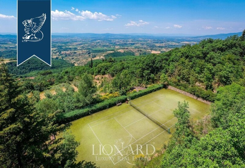 In a stunning panoramic position on the hills around Arezzo, this typical Tuscan farmhouse with an outbuilding for sale offers a big garden with an olive grove, a pool and a tennis court. Renovated with a great taste for luxury, this property consists of two main buildings and a tool shed. The main farmhouse measures 480 sqm and has three levels. On the ground floor there is the garage, while the first floor houses a reading room and two double en-suite bedrooms, one of which is complete with a walk-in closet and access to the terrace. The turret on the second floor is entirely occupied by a bedroom with a bathroom and a terrace. Next to the farmhouse, the 50-sqm outbuilding is an autonomous and independent construction on two levels. Its fine finishes, which enhance its typically Tuscan rustic charm, include external stone walls, internal floors with spectacular combinations of terracotta and parquet, and ceilings with elegant wooden beams. In this property's enchanting 4-hectare garden, a splendid swimming pool with a terracotta sunbathing area offers a magnificent view of the surrounding valley, while on the terrace below a big tennis court is the perfect place for recreation, in the privacy of the most luxuriant Mediterranean vegetation. Ref: 6468.