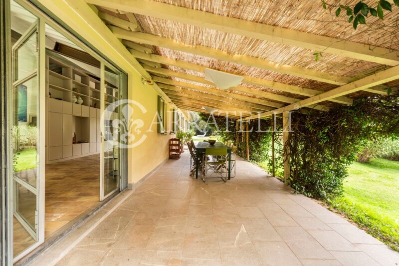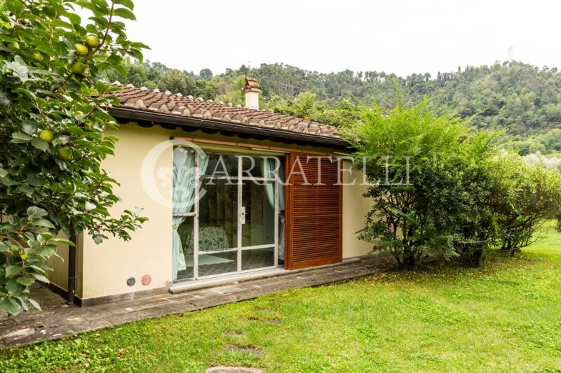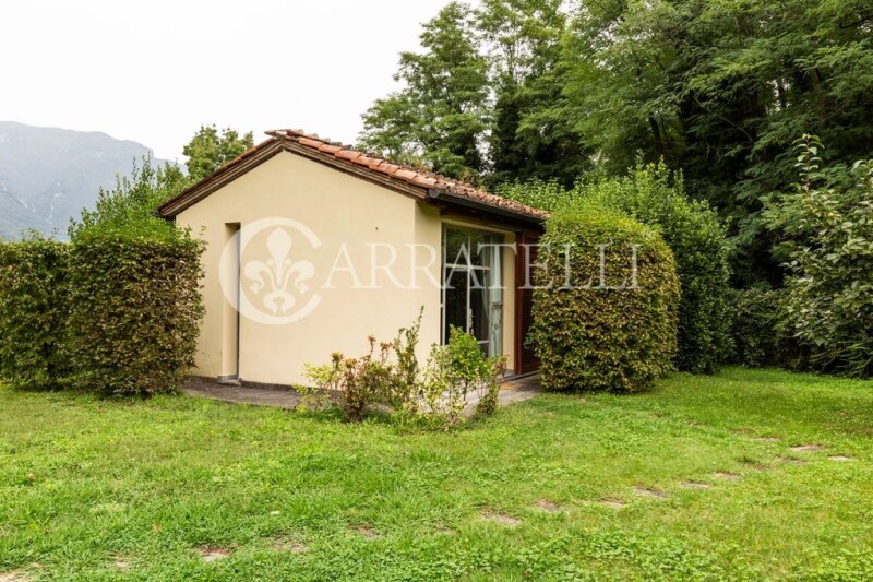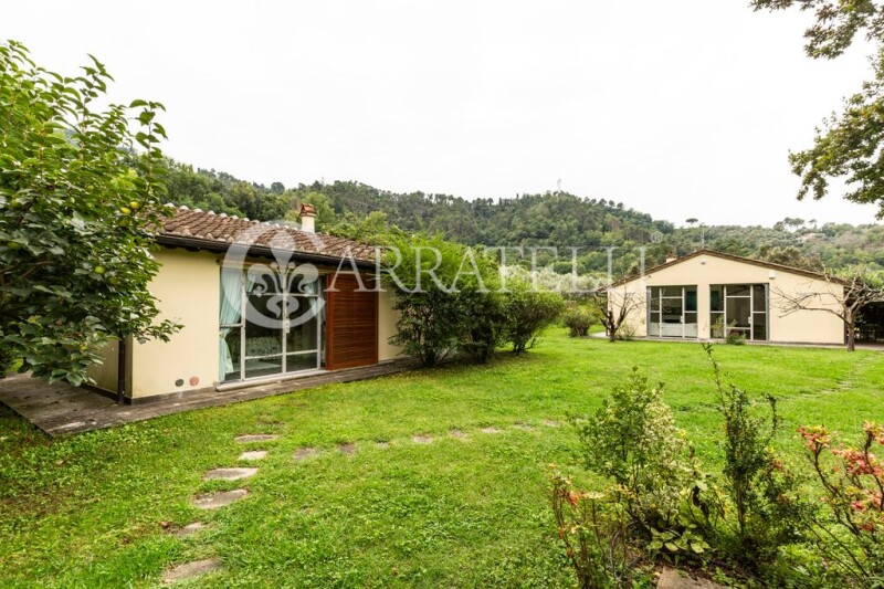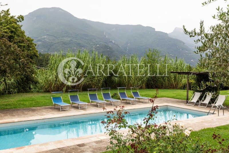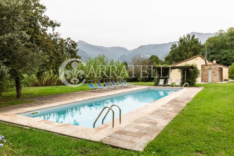 Wonderful Villa of about 340 sqm in the hills of Camaiore, with private pool set in the stones, surrounded by large garden and private land of about 10000 sqm with olive grove and fruit trees, a short walk from the town center and a few minutes from the sandy beaches of Versilia. This beautiful Villa offers all the comforts and total privacy, immersed in an evocative setting with views of the Apuan mountains, the fusion of ancient and modern makes it unique and welcoming, with large openings and plays of light that enhance every little detail, from the modern iron bookcase to the warm hearth, around which the living area and the kitchen are developed. Description The Villa is accessed from a small side road, at the end of which, through a gate, there is access to the property, which consists of three units, a main one consisting of a large open space that includes a sitting room for entertaining guests, a large kitchen overlooking the covered veranda and open to the dining room and the large and bright double-height living room with fireplace; in the main house there are two bedrooms, a double room with bathroom equipped with a bathtub, a twin room, another bathroom equipped with a shower, a lovely loft creates two additional beds, or a relaxation area. The basement, completely surrounded by inspectionable gully, is connected internally and consists of a large hallway to be used as a tavern, two rooms that can become two service rooms, two bathrooms, laundry room, a room for storage use and a boiler room. Detached from the Villa, surrounded by small stone walls are two annexes, two small appendages of the main house, both created with double room and bathroom. The shape of the pool seems to follow that of the main house, crowned by a small porch and surrounded by a green lawn and colorful flowers.. The Villa was completed in 2009, designed and built by an architect who was able to blend natural elements with a unique modern structure. Condition and finishes The Villa is in excellent condition, finished with fine materials, French terracotta, stone fireplace finishes, thermo-furniture, air conditioning in the basement, while the ground floor enjoys natural ventilation that makes the rooms cool in summer. The property is equipped with alarm with cameras, outdoor lighting, automatic irrigation and two water tanks, as well as a small storage shed for agricultural tools. Outdoor Spaces The Villa is surrounded by about one hectare of land, in the flat part we find a large expanse of green lawn with trees and flowering plants, where the living units are located and a carport that accommodates four parking spaces; on the entrance side there is a small terrace with fruit trees and spaces equipped for hanging laundry, in front of the entrance the porch or covered veranda is a great space for lunches and dinners with family and friends. On the other side we find the hilly part characterized by a large area used as an olive grove. Potential uses The Villa can be lived as a second home or main house, but also as an accommodation facility, having two guest houses completely independent from each other and both from the main house. In addition, the outdoor spaces allow you to live moments of relaxation in total privacy. Location The villa enjoys an enviable location, suspended between the Apuan Alps and the hills surrounding Camaiore, within walking distance and just a few kilometers from the towns of Pietrasanta and Forte dei Marmi, famous for elegant restaurants and nightclubs, only kilometers away from the highway exit. Ideal for those who love the countryside and walks along the paths, or by bike, along the tree-lined avenues, but also for lovers of the sea and shopping, among the fine shop windows of Forte dei Marmi or on the promenade of Viareggio with candlelight dinners on the beach enjoying the sunset.