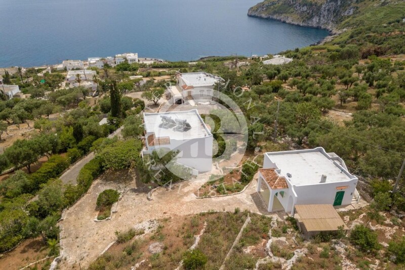 Two Villas facing the sea, with a Swimming Pool to be built - Marina Serra, Marina di Tricase, Salento – Puglia In one of the most beautiful landscape areas, the Regional Park Santa Maria di Leuca - Otranto – Bosco di Tricase, and just 400 meters from the sea, we propose 2 Villas facing the sea in a Garden of 2,000 square meters, rich in typical Mediterranean plants, which slopes towards the sea. The two Villas have different sizes: - The small Villa covers an area of 107 square meters. The rooms are all on the ground floor. From the external porch, you enter the Living area with the Kitchen. To the left of the Living area, however, there are two double Bedrooms, two Bathrooms, and a storage room, which can be used as a laundry. Outside the villa, there is also a Pergola. - The large sea view Villa, of 260 square meters, develops on two levels: the ground floor and the first floor. On the ground floor, a porch leads to the Living Room with the Kitchen. The two rooms are separated by a hallway on the left, which leads to the three double Bedrooms, one with an en-suite bathroom, and a Bathroom. Outside there are two terraces, one covered on the back, and one uncovered on the front of the Villa. On this terrace, you can make a Pergola to have a little bit of shade. From there you can enjoy the sea view in total relaxation. The outside external staircase, next to the living room, leads you to the first floor. The stairs end at a covered veranda, which allows access to the entrance of the open space Living Room with Kitchenette. Beyond the Living area, there is a small Bathroom that can be extended. From the living room, a hallway leads to the two double Bedrooms and another Bathroom. A long balcony runs along the front of the villa overlooking the sea. The property can become a single villa on two levels. The two Villas overlooking the sea are located in a very suggestive position, which is directly accessible from the highway. Immersed in the nature of the Mediterranean Maquis, the two properties are ideal for those who want a quiet, relaxing life, and total privacy. The property is connected to the public water supply and is equipped with heating system. Therefore, it is possible to install radiators and air conditioning. In addition, there is also a public telephone line for internet service and WI-FI. The two villas are located 57km from Lecce, 100km from Salento Airport (Brindisi), and 2.5 km from Tricase. This is one of the most characteristic villages in Salento. The city lies on the eastern stretch of the coast of Salento. Precisely, between Serra dei Cianci and Serra del Mito.