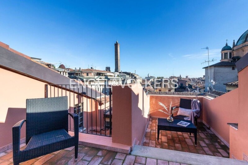 In Piazza Maggiore, within the renowned Palazzo De' Banchi, lies a magnificent panoramic penthouse featuring a romantic, livable terrace with stunning views. This exclusive property boasts bright, panoramic, and peaceful outlooks that enhance its uniqueness and beauty. The entrance, separated from the living area, leads to an incredible living room with breathtaking views of Piazza Maggiore. The room is further elevated by a splendid terrace overlooking the Two Towers and Santa Maria della Vita, perfect for those who love to impress. The eat-in kitchen offers a captivating view of the Clock Tower, while the spacious and well-lit master bedroom provides a serene atmosphere. An additional study with an en-suite bathroom featuring a window serves as a convenient and versatile space. The main bathroom, also with a window, is generously sized and includes both a bathtub and a shower. Completing the property is a cellar in the basement, with the possibility of purchasing a nearby parking space. With minimal condominium fees and immediate availability, this is a true gem in the heart of the city, ready to be experienced. (The information and floor plans provided are for indicative purposes only and do not constitute contractual elements) Description of the Location Palazzo De' Banchi, also known as the Portico del Pavaglione, is a historical building in Bologna dating back to the 15th-16th century, located in Piazza Maggiore. It is the last building constructed in Piazza Maggiore. Between 1565 and 1568, the façade was designed by Jacopo Barozzi, known as Vignola, to provide the square with greater uniformity, as the previous frontage consisted of a series of medieval structures. The magnificent façade was intended to conceal the market streets behind it, creating an impressive visual effect.
