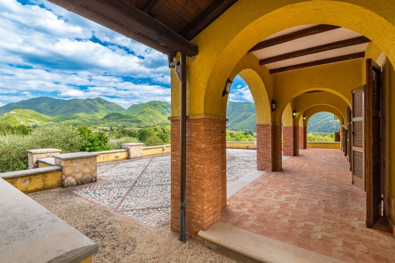 Villa Adriana- Atina- Immersed in the beautiful and verdant valley of comino, we sell this magnificent villa / farmhouse built in the 2000s, with a style typical of a country house. Villa Adriana is an important property of over 400 square meters of building and a land of over three hectares of which a part cultivated with olive groves with 500 plants (well maintained) .The villa for sale in Atina is located in a hilly, sunny and dominant area, between Atina and Villa Latina in the area bordering the former Palombo vineyard / cellars. It enjoys an enchanting view of the Comino Valley and the Abruzzo National Park. It is easily reachable from the Formia-Cassino-Sora highway with the Atina exit and the property is about 50 minutes from the sea of Formia and 30 minutes from the ski fields of Pescasseroli. The property for sale also has three driveways, 2 of which with cars etc and one with agricultural vehicles to allow the cultivation of the olive grove. Entering from the main entrance (Via le Lamie) you enter a beautiful avenue that leads in front of the villa and the front garden. The style of the villa / farmhouse is immediately striking with its well-finished architectural form made of anti-seismic reinforced concrete (with thermal coat). The villa is spread over three levels, one of which on the S1 floor (where we find all the services), and 2 floors above ground. On the ground floor we have a wonderful and welcoming living room with fireplace, floors and walls in Battipaglia terracotta, ceilings with decorative and hand-carved beams. The large central wall fireplace is all in hand-carved travertine, the built-in kitchen is completely covered with original hand-painted ceramics. Both the kitchen and the living room lead to the porch of the panoramic terrace. Still on the ground floor there are two more bedrooms and three bathrooms, the bedrooms have vaulted ceilings. The upper floor is practically all used as a sleeping area with 4 bedrooms. bed with exposed beams and two bathrooms finely finished with hand-painted ceramics. Each bedroom has a different, unique and particular color with typical farmhouse painting, giving a warm and welcoming environment. The doors of this villa are all in solid wood, the stair coverings in travertine and hand-carved wood. The roof is made with ancient tiles of the "700" and Romanelle, while the ornaments of the windows and external stairs are all in hand-carved travertine. In the basement part there are garages, cellars, technical rooms, storage rooms and a bathroom. Finally, among the appurtenances we have a small outbuilding and a shed for agricultural vehicles. Utilities: all utilities are connected and functioning, the villa is sold fully furnished with important furniture and furnishings. Due to the position and quality of the villa / farmhouse, it also lends itself well as an accommodation facility and / or agritourism. For further information and / or on-site visits, call.