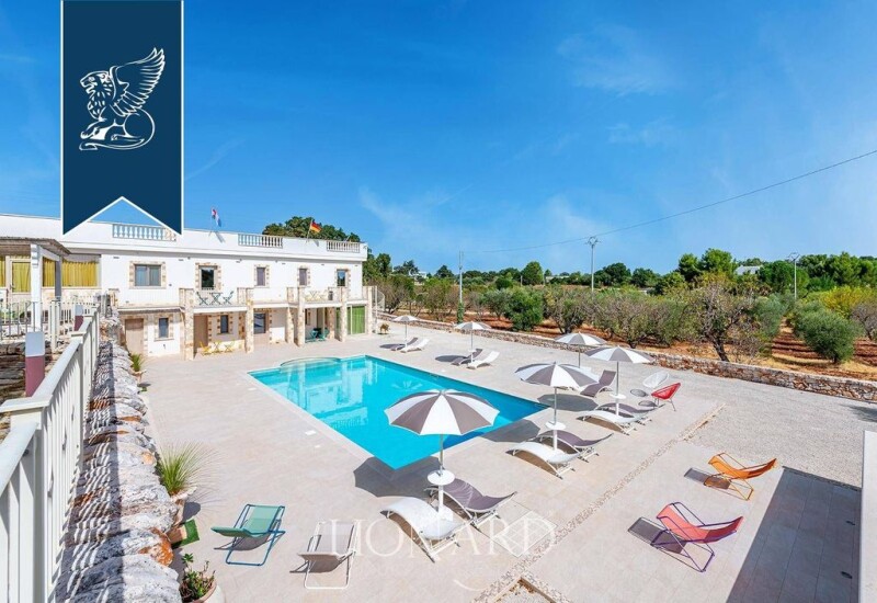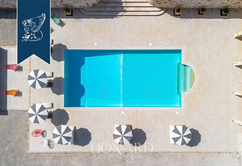 In Ostuni, the white city of Salento, this splendid luxury villa with an elegant and modern design is on sale with a total surface of 500 square meters. Immersed in a private park of 15000 square meters, this residence enjoys a privileged position in the countryside that surrounds Ostuni, given the proximity to Gems of Salento such as Alberobello and Locorotondo, and to fine sandy beaches and turquoise sea such as Torre Guaceto and Baia dei Camerini. This wonderful residence offers 7 large double bedrooms, with En Suite bathroom, finely furnished with rustic -style furniture, expertly chosen to reflect the atmosphere and uniqueness of the surrounding context. The living area of property consists of a living room with dining room and equipped kitchen, with large windows that give the environment a warm and welcoming atmosphere. The property completes a 70 sqm annex with veranda. Outside, immersed in the private garden perfumed by olive trees, almonds and centuries -old oaks, there is a splendid swimming pool of about 80 square meters embellished with a bottom of glass mosaic, and surrounded by an equipped solarium. Here there are also two large gazebos used as a light lunch and relaxation area, ideal for enjoying excellent moments in company refreshed from the wind of the Apulian countryside. Ref. 10714.