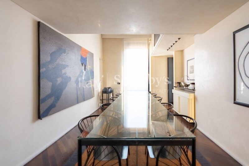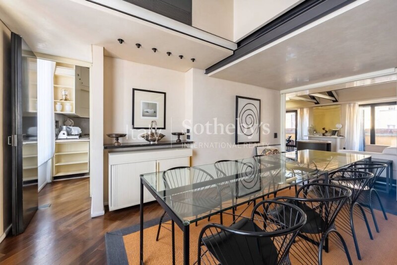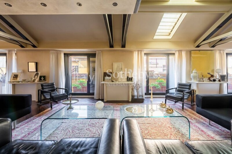 In the privacy of the small, tranquil historic streets near Sant'Ambrogio, this spacious penthouse occupies the third and fourth floors of a prestigious building that has been carefully redeveloped from the former Cova carriage factory. The building's façade is adorned with bas-reliefs by the renowned artist Arnaldo Pomodoro. The living area, located on the fourth floor, is comprised of a large reception area with a grand living room, which opens onto an exclusive mezzanine with a music zone. Four delightful pocket balconies illuminate and air the living room, while a private and quiet terrace offers a pleasant space for dinners with friends in a secluded setting. The floor is completed by a dining room, kitchen, and guest bathroom, with the convenience of two separate entrances to meet all logistical and hospitality needs. On the floor below, entirely separate from the living areas of the house, is the sleeping zone, consisting of four bedrooms, a study/dressing room, and three bathrooms, along with an additional entrance. Renovated in the 1980s, the large spaces and their intelligent use make this home ideal for families who love to entertain but also value the comfort and privacy of their living space. Two spacious garage spaces within the building are available for an additional fee, completing the property. The building also offers full-day concierge service.
