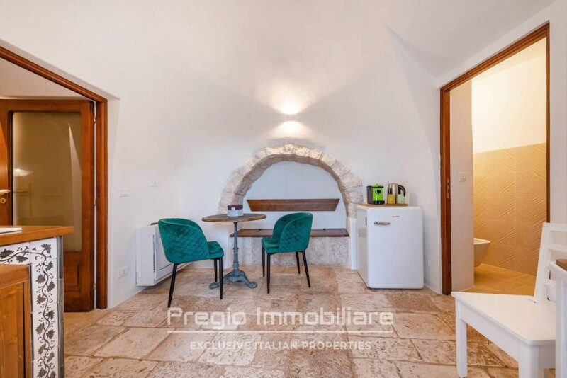 We are pleased to present you with this extraordinary real estate complex, an authentic gem situated in an unparalleled natural beauty setting. Located just a few kilometers from Cisternino, on a plot of land of approximately one and a half hectares, this complex embodies hospitality excellence, harmonizing precious traditional architectural structures with modern technologies and refined design choices. The property comprises five residences, consisting of trulli (nineteenth-century constructions) and independent lamias, completely renovated along with the entire property in November 2023, with scrupulous attention to detail and aesthetics. Each of these dwellings is furnished with high-value furniture, with a particular focus on quality and elegance, ensuring refined and functional spaces. The residences include a main house of over 80 square meters with two bedrooms, two eat-in kitchens, and two bathrooms; a second main house of about 60 square meters with two bedrooms, an eat-in kitchen, a living room, and two bathrooms; and three other spacious two-room houses, each with a kitchen-living room, a bedroom, and a bathroom. In addition to the houses, the property offers a storage space used as a wine cellar, fully equipped with all necessary utensils. The outdoor spaces are ample and well-maintained, including verandas, charming porches, and a large paved area. A focal point of this property is the spectacular infinity pool, a hidden saltwater overflow pool with breathtaking nighttime lighting, immersed in a panorama that offers an enchanting view of the valley and the surrounding citrus grove. This pool is equipped with state-of-the-art heating and uses saltwater. The surrounding land extends over 1.5 hectares, featuring an intricate vineyard, an olive grove consisting of 65 mature trees and 20 young ones, an orchard with almond, walnut, fig trees, and a citrus grove consisting of 100 trees, including 30 mature ones. The property is characterized by a well-designed landscaping, featuring English lawns and Mediterranean plants, all lit in an evocative manner. The property is equipped with a heating system using a water heat pump and hot-cold split, walnut wood fixtures with double glazing, Chianche and Sicilian terracotta floors, and an old wood-burning oven that adds a traditional touch. Technical and energy aspects are also noteworthy: the property also has a 6 kW photovoltaic system with an 11.5 kW storage battery and solar panels for hot water. High-speed internet is guaranteed through Starlink and TIM. This property represents a true gem, offering perfect sound and light isolation conditions, providing the opportunity to enjoy the enchanting natural landscapes of the Itria Valley. Ideal for a high-level tourist-accommodation investment, yielding significant returns. Furniture is included, and the property is available immediately.