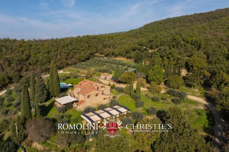 On the hills of Tuscany, not far from Arezzo, 39.5-hectare estate with Agriturismo. The property consists of a typical restored Tuscan farmhouse, divided into two apartments for a total of 4 bedrooms. The farmland surrounding the house includes an olive grove with 800 trees and portions of arable land that could be used to plant new crops. A private water supply ensures total independence on that front. Services are available a short distance from the property, about 5’ drive, and the historic center of Arezzo can be reached in about 15’. From here one can then reach most of the art cities of Tuscany in less than an hour (Cortona, Montepulciano, Pienza, Florence, Siena...). DESCRIPTION OF THE BUILDINGS, STATE AND FINISHES The farmhouse (315 sqm – 3,389 sqft, 4 bedrooms and 3 bathrooms) is a two-story rural building that still maintains the old division between agricultural premises on the ground floor and living quarters on the first floor. The lower level consists of cellars, tool storage rooms and a service bathroom. The upper level, on the other hand, is divided into two apartments with independent access from the outside loggia: - Apt. A (65 sqm): living room with dining area, kitchen, two bedrooms and bathroom; - Apt. B (75 sqm): living room with dining area, kitchen, two bedrooms and bathroom. In terms of finishes, the farmhouse has been entirely renovated keeping in mind the original Tuscan style and most of the typical features have been preserved, including stone walls, wooden beams and original terracotta floors. A short distance from the farmhouse is a technical room (30 sqm – 323 sqft) where the property’s systems are housed and a carport. The house is surrounded by 3,800 sqm of well-kept garden, decorated with hedges, ornamental plants and flowers that give color in summer. In front of the house is the 14 × 6 m swimming pool with a sunbathing area and a gazebo where poolside dinners and breakfasts can be organized. The area around the building is also very suitable for placing gazebos and marquees for events. EXTERIOR The farm has 39.1 hectares (96.6 acres) of agricultural land, mostly covered by woods (20.0 ha) and arable land (15.1 ha), very suitable for planting new crops or even a vineyard. Water supply is ensured by a private well (much akin to a natural spring) located right inside the property. The olive grove (4.0 ha) features roughly 800 trees that allow the production of 600 to 1,000 kg of Tuscan extra virgin olive oil each year (depending on the season and weather). CLOSEST CITIES AND TOWNS Closest services (2,5km; 5’), centro storico di Arezzo (6km; 15’), Castiglion Fiorentino (23km; 30’), Sansepolcro (34km; 35’), Cortona (35km; 40’), Montepulciano (57km; 55’), Pienza (64km; 1h 5’), Gaiole in Chianti (64km; 1h 5’), Castiglion del Lago (69km; 55’), Montalcino (80km; 1h 20’), Siena (80km; 1h 10’), Florence (82km; 1h 15‘), Perugia (88km; 1h 15’), San Casciano in Val di Pesa (91km; 1h 10’), Orvieto (113km; 1h 25’) CLOSEST AIRPORTS Perugia San Francesco (87km; 1h 15’), Firenze A. Vespucci (103km; 1h 20’), Grosseto C. Baccarini (145km; 1h 55’), Pisa G. Galilei (163km; 1h 55’), Bologna G. Marconi (184km; 2h 5’), Roma Ciampino (235km; 2h 30’), Roma Fiumicino (248km; 2h 35’).