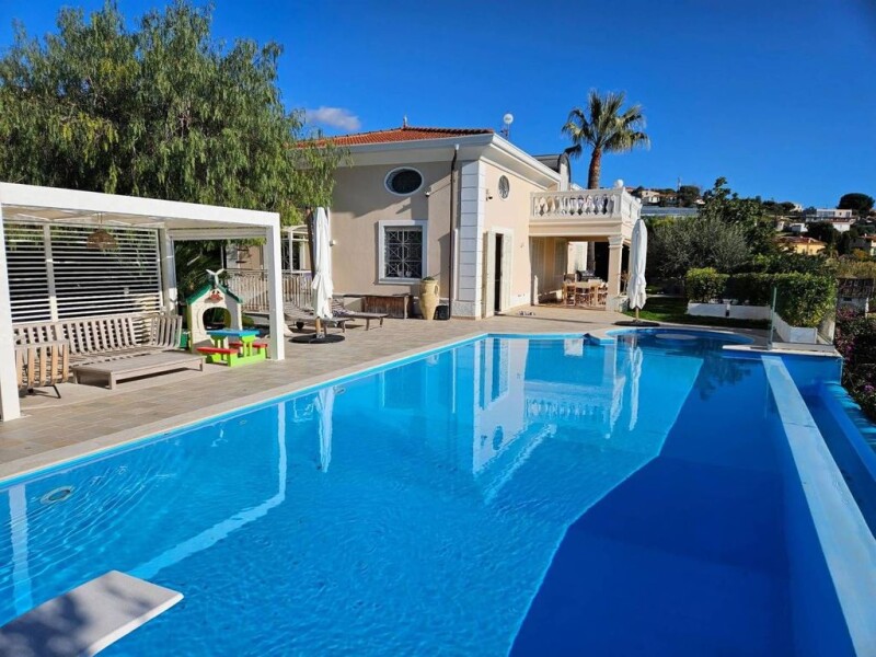 Sanremo, located on the first hill in a quiet residential area, very sunny exposure with full sea view, villa in perfect condition on 3 levels with garden, terraces, barbecue area and swimming pool. The villa is composed on the ground floor of entrance hall, living room with fireplace, study, kitchen, sleeping area with master bedroom, walk-in closet, bathroom and guest bathroom; on the first attic floor there are 3 bedrooms, 2 bathrooms, laundry room and terrace; in the basement a large tavern equipped with an American kitchen, billiard area and TV, including gym, bathroom and laundry room. The property is fenced and equipped with electric gate and anti-theft system.