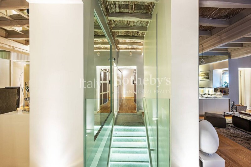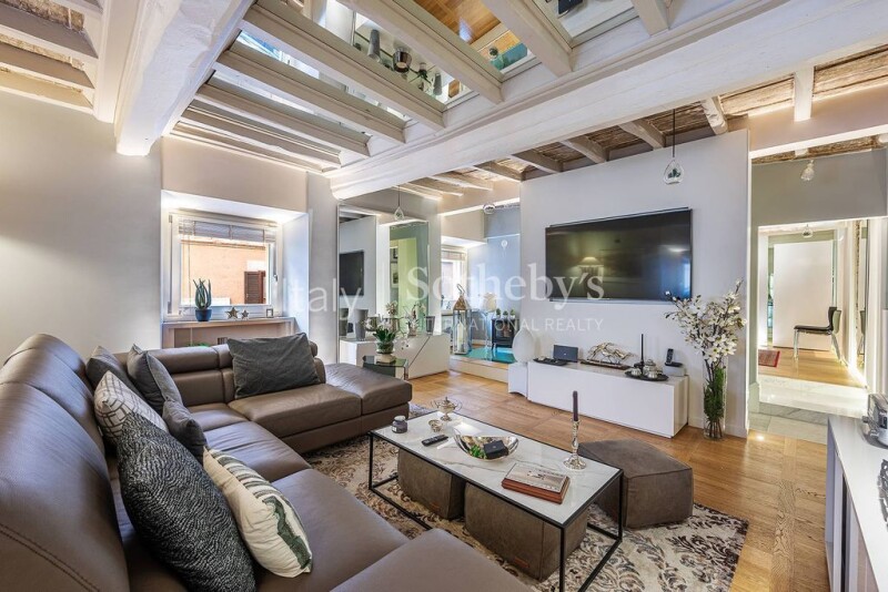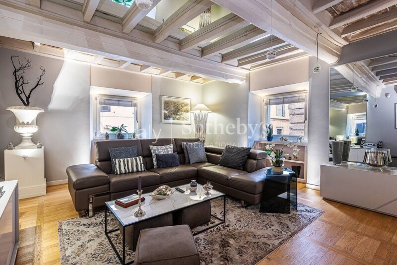 In a privileged location, in the heart of Rome's historic center, lies this exclusive apartment situated on the first floor of an elegant historic building on Via dell'Arco della Ciambella, just a few steps from the Pantheon and the ruins of the Baths of Agrippa. With a surface area of approximately 150 sqm (1614,59 sq ft), the property stands out for its spacious and well-distributed interiors. The property, recently renovated, is offered fully furnished and move-in ready. It features a private entrance with a modern, designer staircase leading to the first floor. The layout includes a spacious living room, dining area, fully equipped kitchen, two bedrooms-one of which has an ensuite bathroom-two elegantly finished bathrooms, and a laundry area. The apartment is distinguished by its exposed beam ceilings, where glass and wood inserts lend a unique and contemporary character. The wavy panel walls add a three-dimensional and dynamic touch, while the exposed brick arch is a refined feature that recalls the building's historical past, creating a sophisticated contrast with the modern finishes. The stone and brick walls further enhance the property's authenticity and warmth, perfectly balanced with contemporary design solutions. Every room is enriched by furnishings included in the sale, emphasizing the elegance and functionality of the spaces. The property benefits from three views: onto Via di Torre Argentina, Via dell'Arco della Ciambella, and a third overlooking the internal courtyard with an ancient fountain. The strategic location of Via dell'Arco della Ciambella allows residents to fully experience the authenticity and charm of Rome, with excellent transport links and a wide range of services, boutiques, and cultural attractions all within walking distance. This property represents a rare opportunity for those seeking to combine historical prestige with modern comfort in a residence that is ready to be lived in.